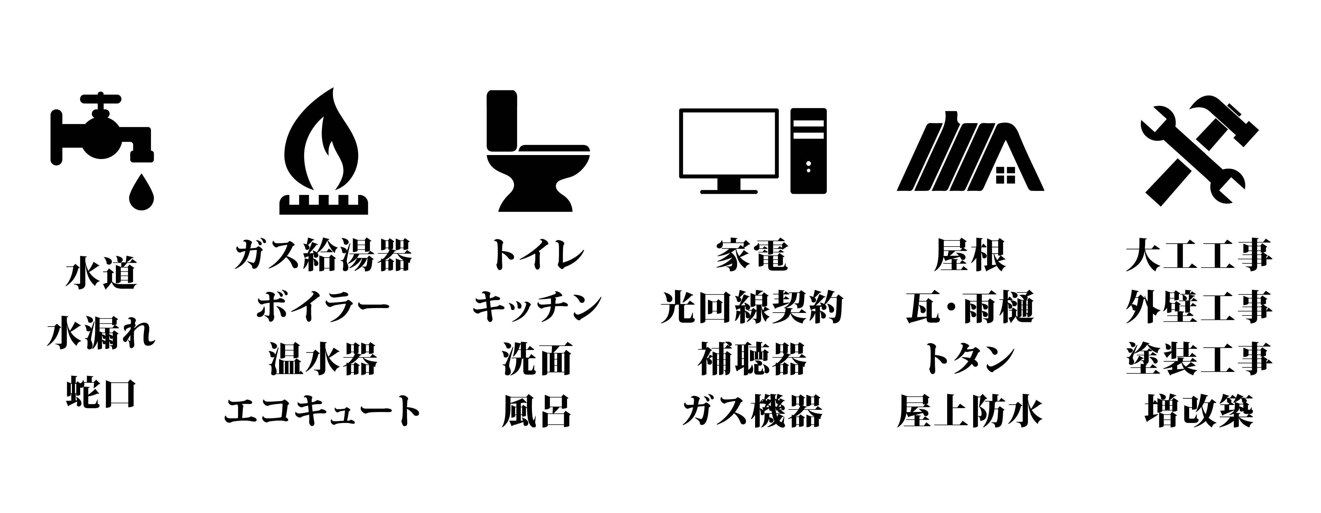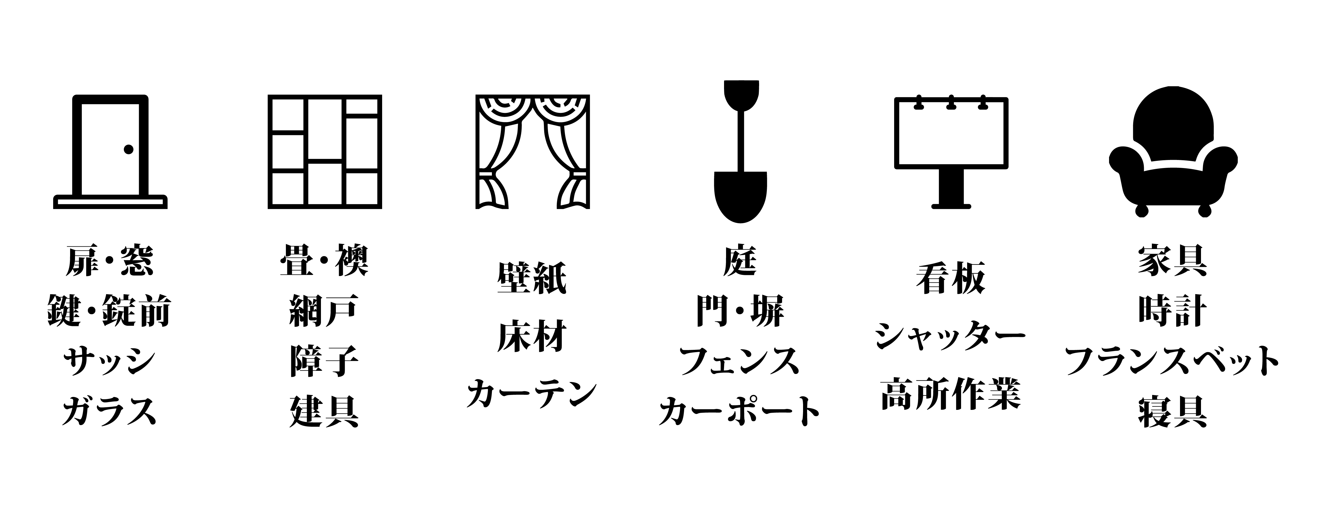 住まいの修理 リフォーム 白蟻、害虫駆除 家財整理 看板 シャッター 高所作業 店舗厨房 給排気ダクト 消防設備
